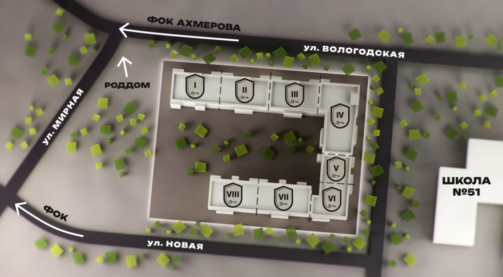 Территория ЖК ограничена с севера ул. Вологодская, с юга – ул. Новая, с востока ул. Взлётная, с запада – территорией земельных участков индивидуальных жилых домов по ул. Мирная, где располагаются 2-3 этажные индивидуальные жилые дома.